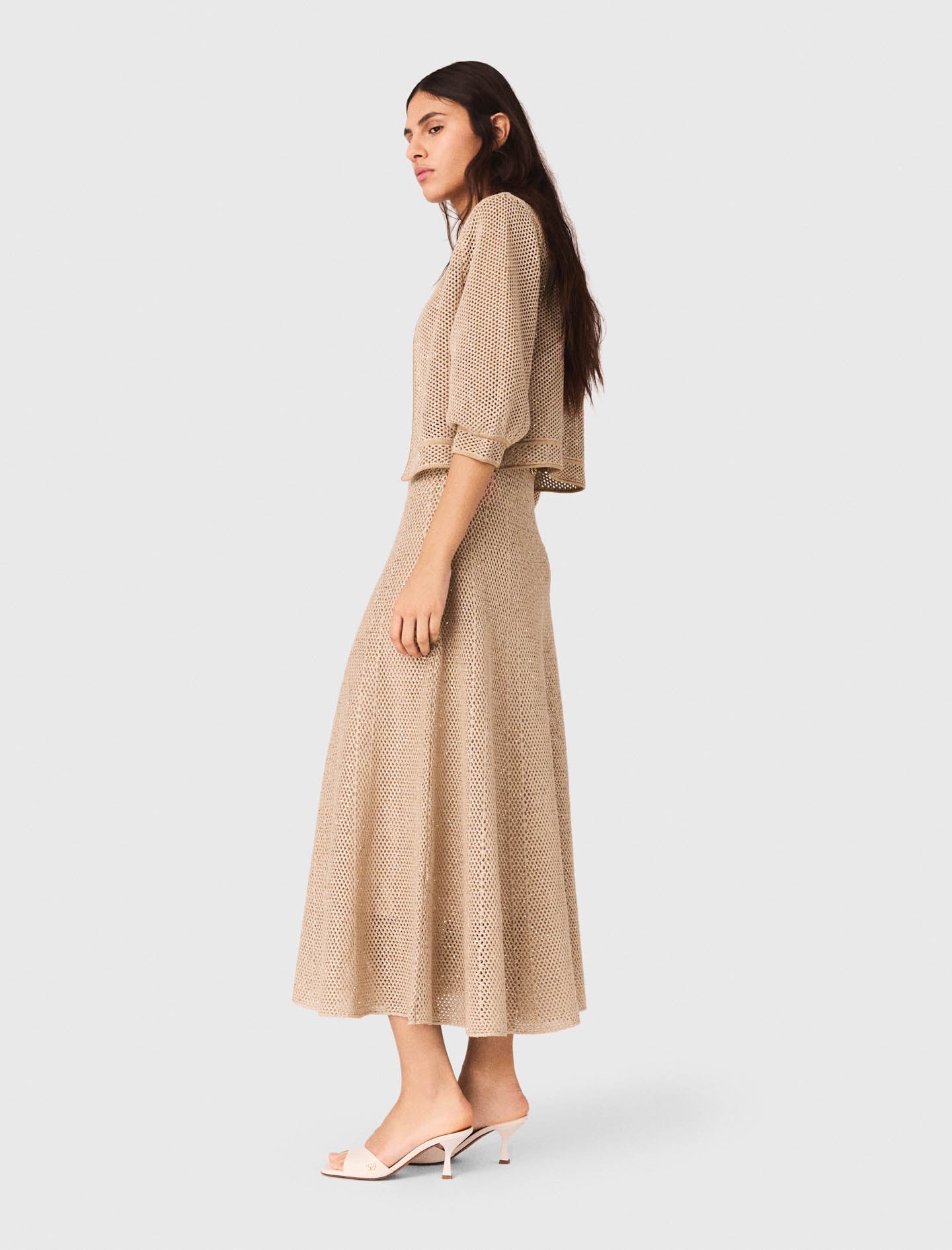 This cropped openwork knit cardigan, enhanced with fine sequins and denser plain trim, creates a straight, airy silhouette. Its balloon sleeves and gold fastening add a precious touch.